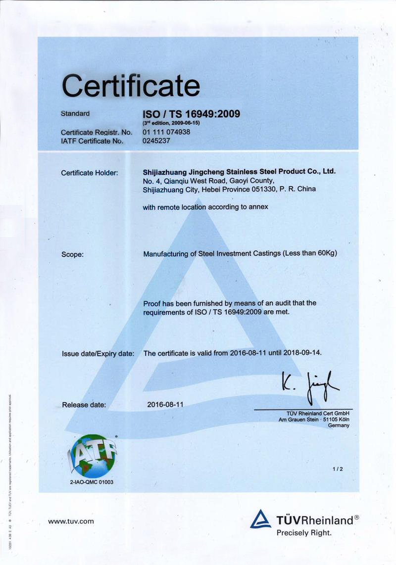 石家莊市精誠(chéng)不銹鋼制品有限公司,是一家從事專業(yè)精密鑄造的企業(yè)。主要生產(chǎn)不銹鋼、合金鋼、低碳鋼及各種特種合金材質(zhì)的精密鑄件及加工產(chǎn)品。